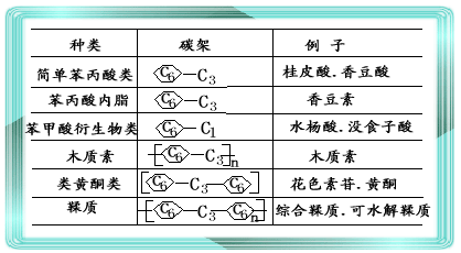 二、酚类的生物合成 1.莽草酸途径(shikimic acid pathway)(图5-7) 2.丙二酸途径(malonic acid pathway)(图5-8) 三、简单酚类(simple pheolci compound) (1)简单苯丙酸类化合物 (2)苯丙酸内酯类化合物 (3)苯甲酸衍生物类 1.概念:简单酚类的醇衍生物的聚合物 2.合成过程(图5-11) (以苯丙氨酸和酪氨酸为起点) 五、类黄酮类(flavonoid) 1.基本骨架(图5-12) 2.种类:花色素苷、黄酮、黄酮醇和异黄酮 3.功能:呈现颜色、防御伤害 六、鞣质(tannin) 有防御功能,有毒。 可分为:缩合鞣质和可水解鞣质 |